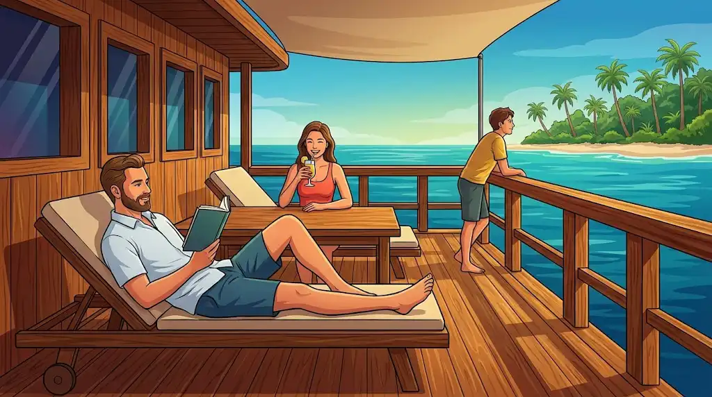 El ritmo diario a bordo de un crucero de buceo indonesio sigue un patrón predecible de comer-dormir-bucear que maximiza el tiempo bajo el agua: