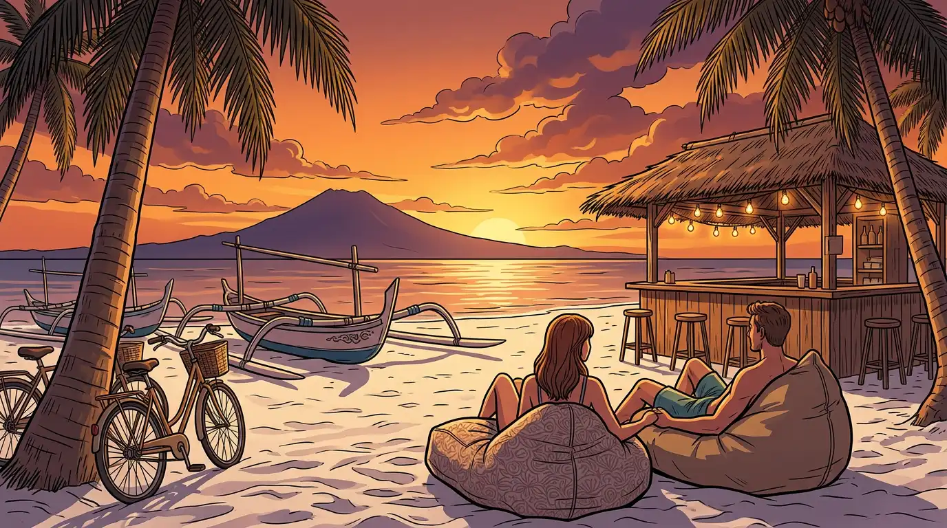 吉利特拉旺安是三座岛中面积最大、最热闹的一座。它被公认为“派对之岛”,凭借海滨酒吧、夜市以及充满雷鬼风情的夜生活,吸引了众多年轻且热衷社交的游客。但吉利特拉旺安远不止于派对。 岛屿西侧可欣赏到巴厘岛阿贡山(Mount Agung)上壮丽的日落,周边的珊瑚礁更是浮潜和初级潜水的不二之选。这里海龟成群,而吉利特拉旺安与吉利梅诺之间海床上的著名水下雕塑群,已成为印尼最受摄影师青睐的潜水胜地之一。